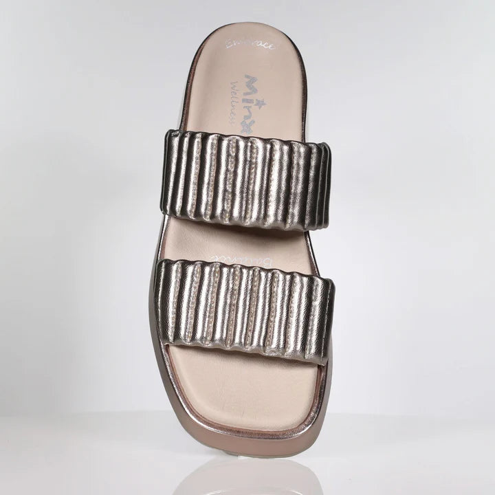 Introducing the Breeze SANDAL from Minx. This luxe metallic slide blends sculptural straps with cushioned comfort for everyday glamour.