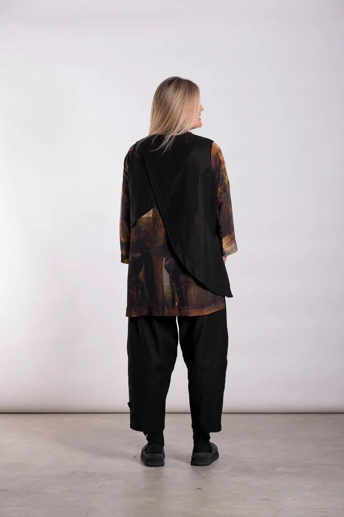 This is a structured yet easy-wear women’s vest designed to layer effortlessly over dresses, tops, and shirts. Featuring an asymmetrical front hem and button detail through the upper bodice, the Frankie Vest adds shape and interest without bulk, creating a strong but wearable silhouette.