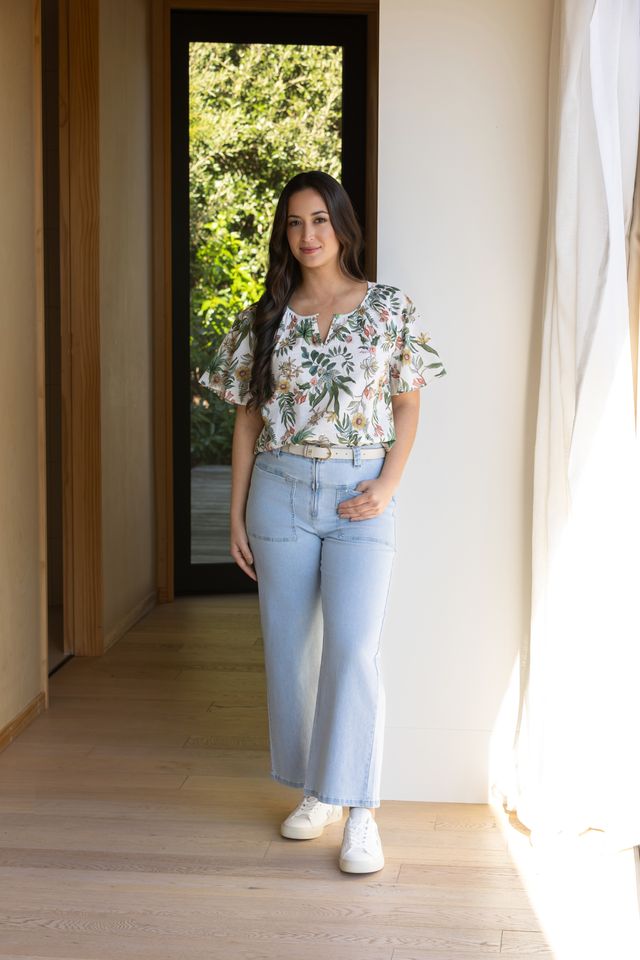 Made from lightweight 100% cotton with a linen look, this Hazel Top in Wild print features a bound round neckline with an enamel button and gentle gathers at front and back. Its floaty raglan sleeves and relaxed fit keep it breezy and perfect for warmer days.