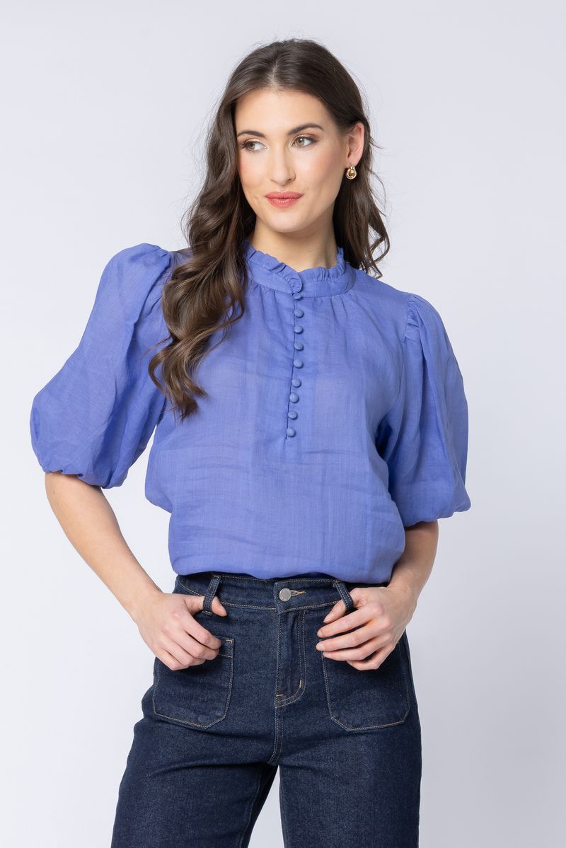 The Leila + Luca Royal Nina Blouse is all about quiet polish. Made from a lightweight fabric with a soft sheen, it features covered buttons, puff sleeves, and a subtle frill neckline. Tuck it into denim or tailored pants for an effortlessly put-together look.