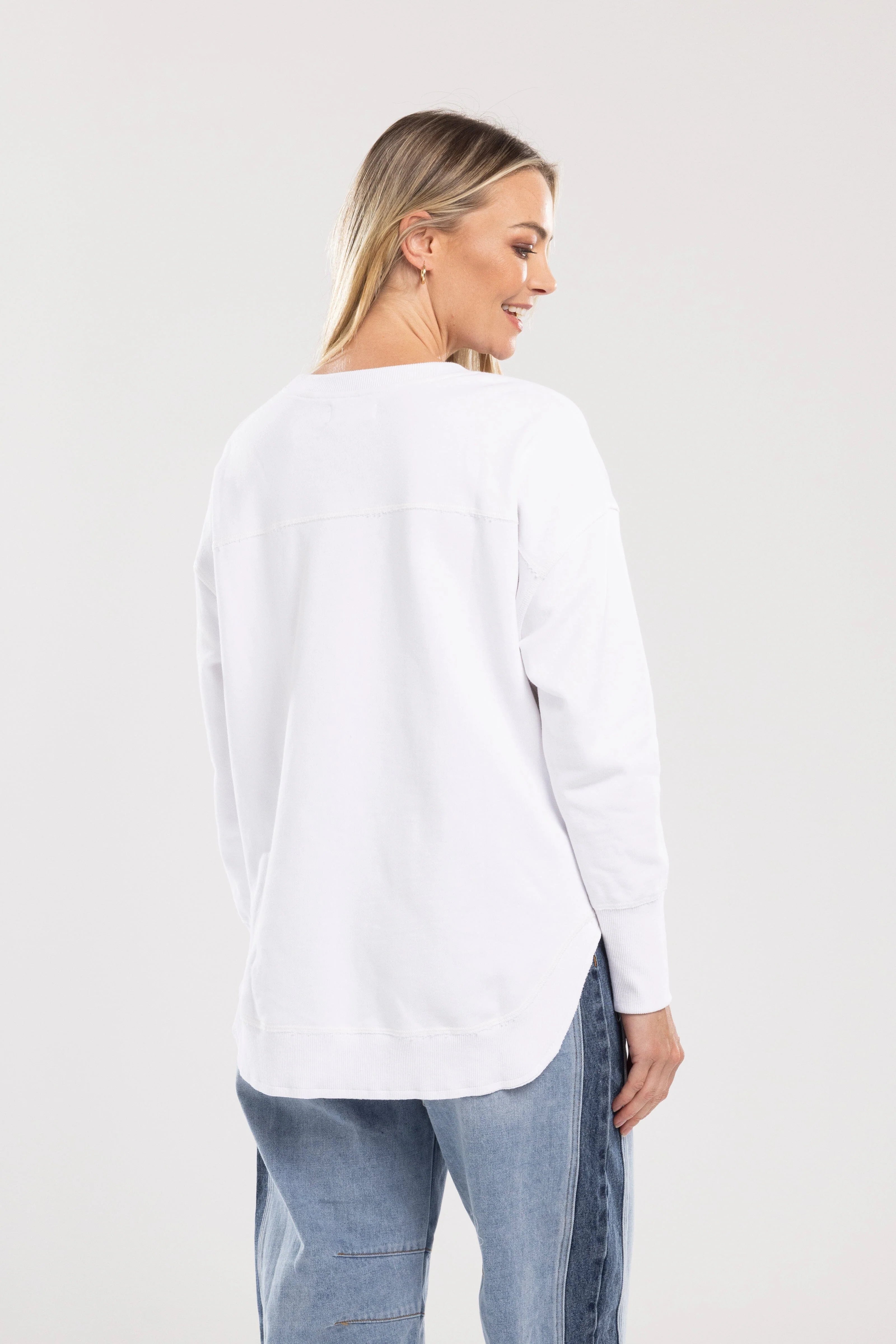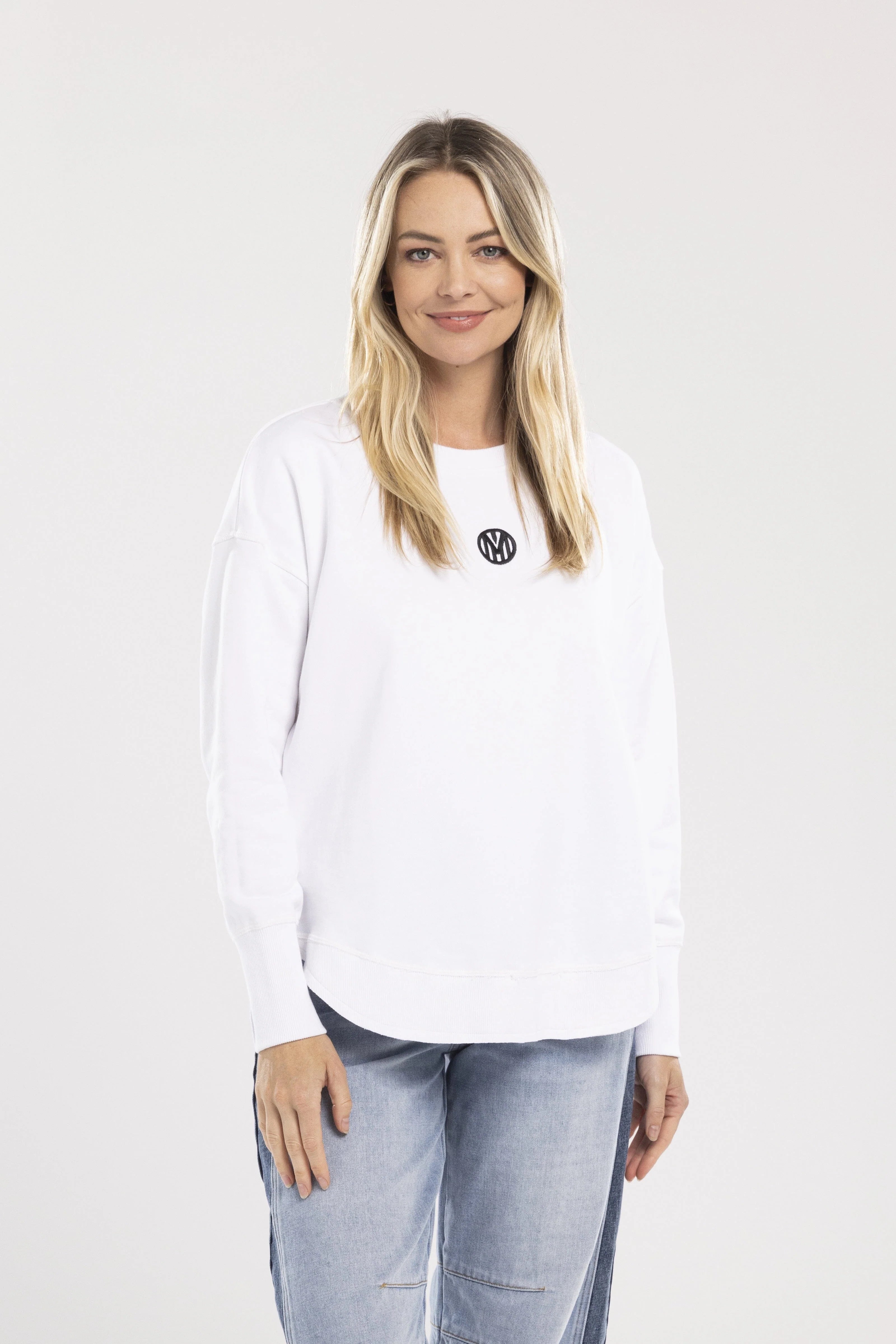 Introducing the ENA White Sweat from Mi Moso. This relaxed white sweatshirt is an effortless staple for everyday wardrobes.