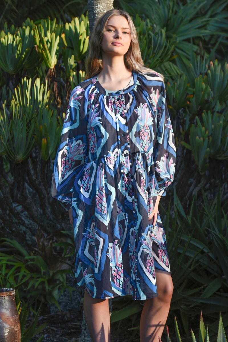 Introducing the BUTTONED UP BLISS DRESS from COOP. A relaxed, artful day dress in a navy, pineapple-inspired print that’s ideal for everyday wear.