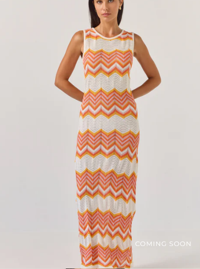 Introducing the Chevron maxi dress from Tuesday Label. This sleeveless, open‑knit piece showcases retro chevron stripes in warm orange, yellow and white and is designed for effortless summer style.