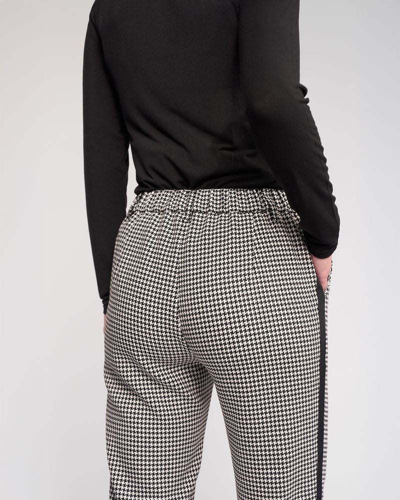 Slim-leg ankle-grazer pant in the Summit pattern, a classic black and white houndstooth. Designed with a flat front waistband and an elasticated back for comfort and ease.