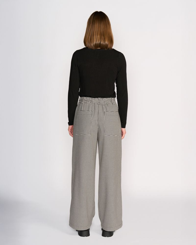 Full-length wide-leg pant in our Summit print — a classic black and white houndstooth. Designed with a drapey fit, this pull-on style features an elasticated waistband and a slim self-tie belt.