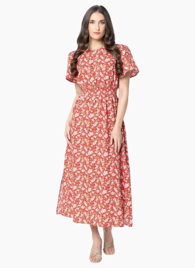Introducing the Social Dress Scarlett Bouquet from Leila + Luca. This breezy floral midi dress is a staple in the Dresses edit, offering effortless summer style with a vivid scarlet red bouquet print.