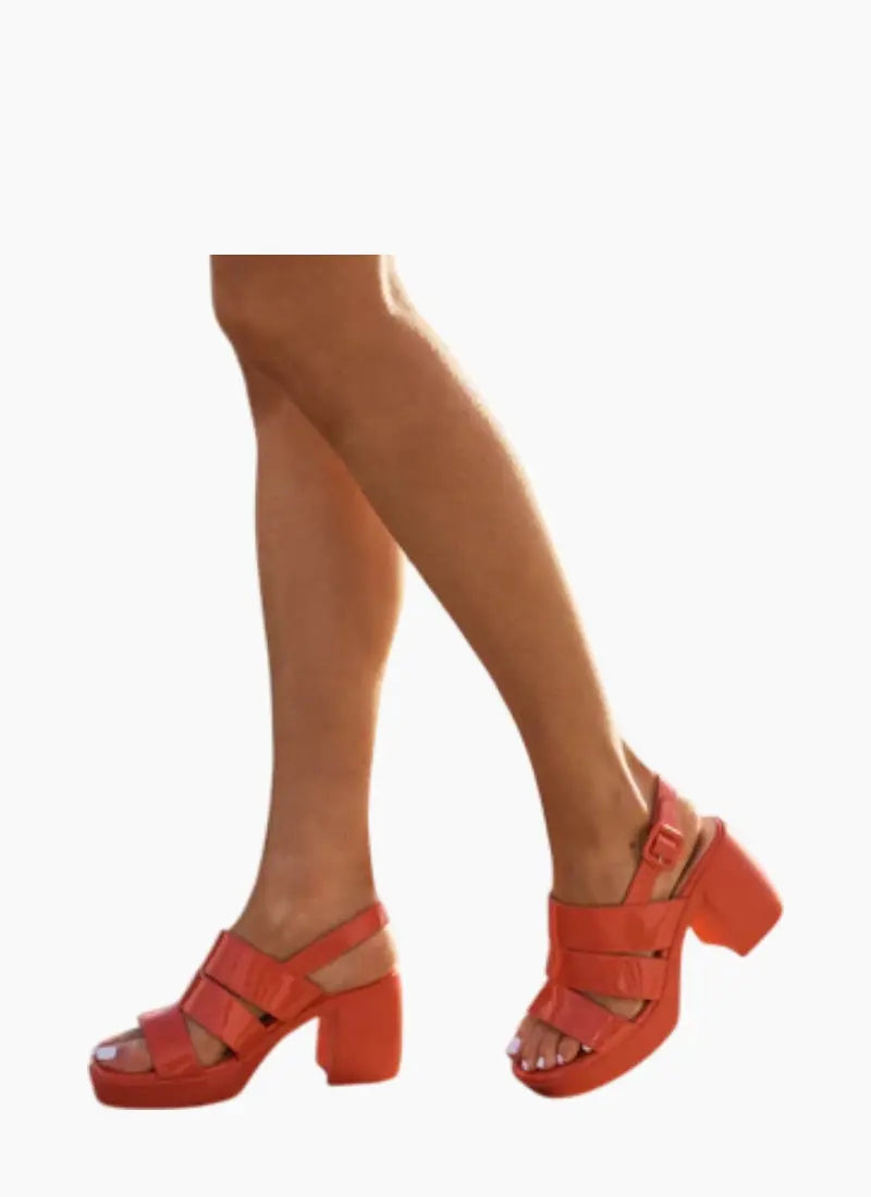 Introducing the EOS Spiced Melon Crinkle from EOS. A bold coral platform sandal that brings retro charm with modern polish.