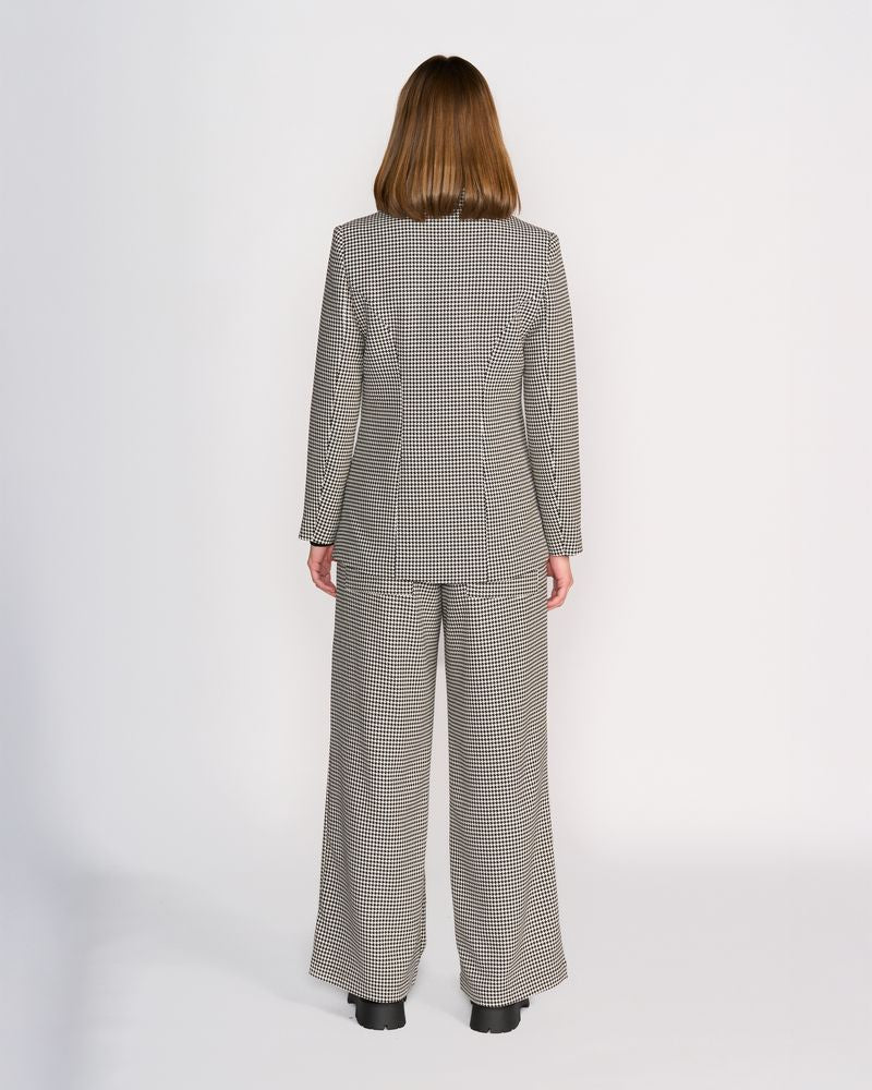 A fully lined tailored blazer in our Summit print, a classic black and white houndstooth. Designed with a structured collar and a three-button front closure featuring self-covered buttons, this style is shaped through the body with princess seams running from shoulder to hem at the back.