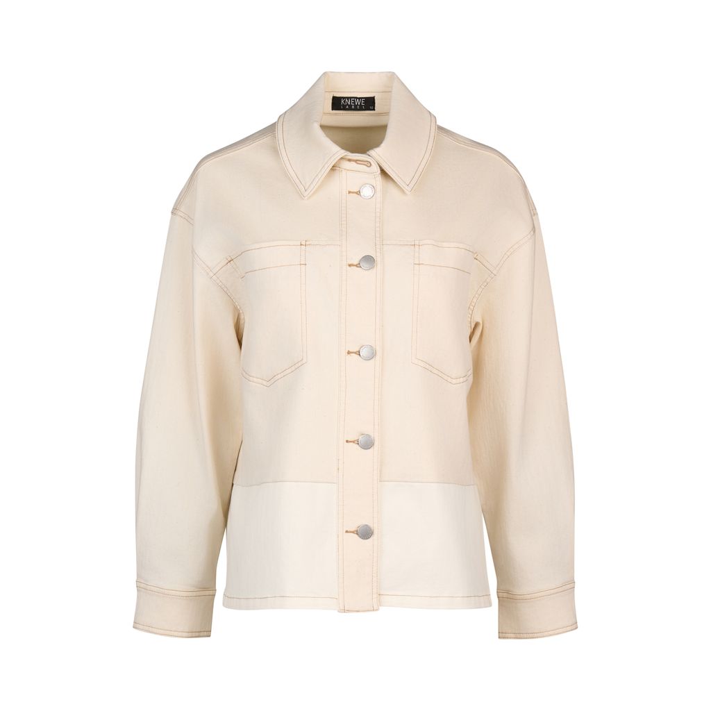 The State Denim Jacket is a fresh take on a classic style, cut in a long boxy fit from stretch denim. Designed with contrast white denim along the hem for a two-tone look, it adds a twist to your everyday layers. Finished with patch pockets and classic button details.