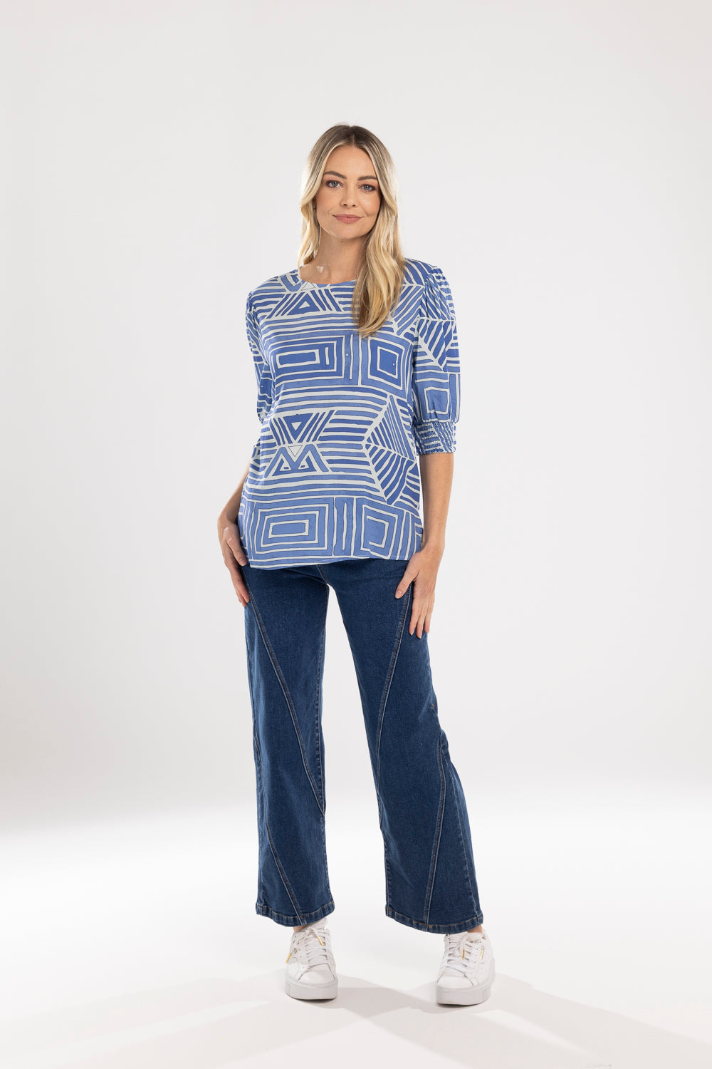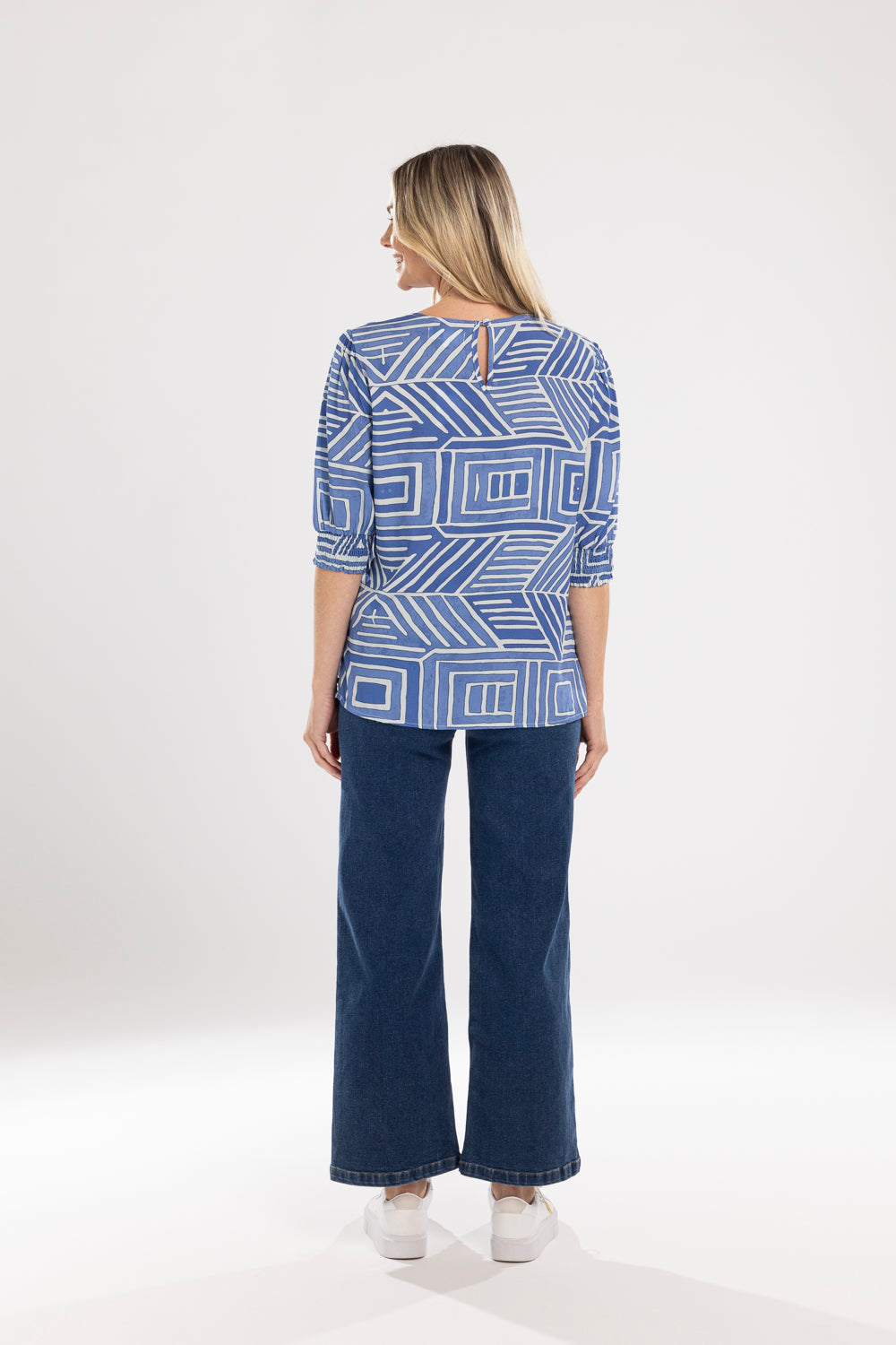 Introducing the MI MOSO Finley Blouse — a fresh addition to your women's Tops collection in a vibrant blue geometric print. This easygoing blouse brings pattern and polish to everyday dressing.