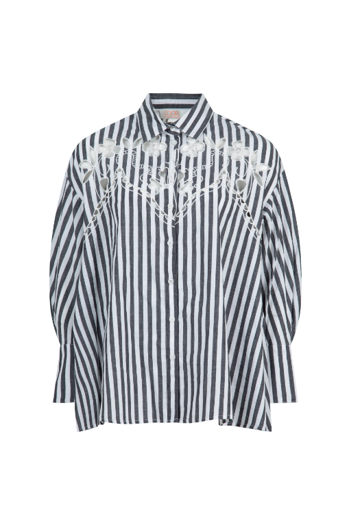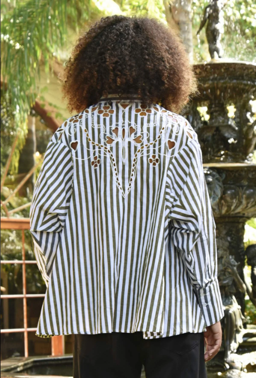 Step out in bold stripes this season in the ‘Cut to the Chase’ shirt. Crafted in the soft ‘Draw the Line’ yarn dyed cotton, this top showcases an intricate cut out embroidery which adorns the front and back. With generous batwing sleeves and an exaggerated cuff this shirt is nothing short of eye-catching details.