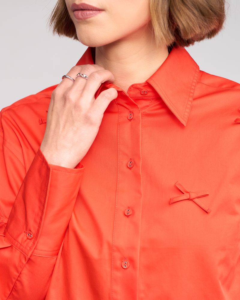 Crisp cotton shirt in Lava, a bold bright orange. Designed with classic shirting details, the front is finished with fabric bow appliqués for a playful twist on a timeless silhouette, while the back remains clean with traditional shirt construction, including a back yoke and centre box pleat.