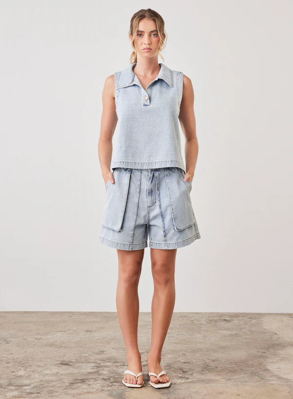 Introducing the Riptide Denim Short from Esmaee. These light blue denim shorts bring relaxed coastal style with everyday versatility.