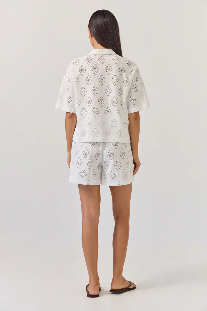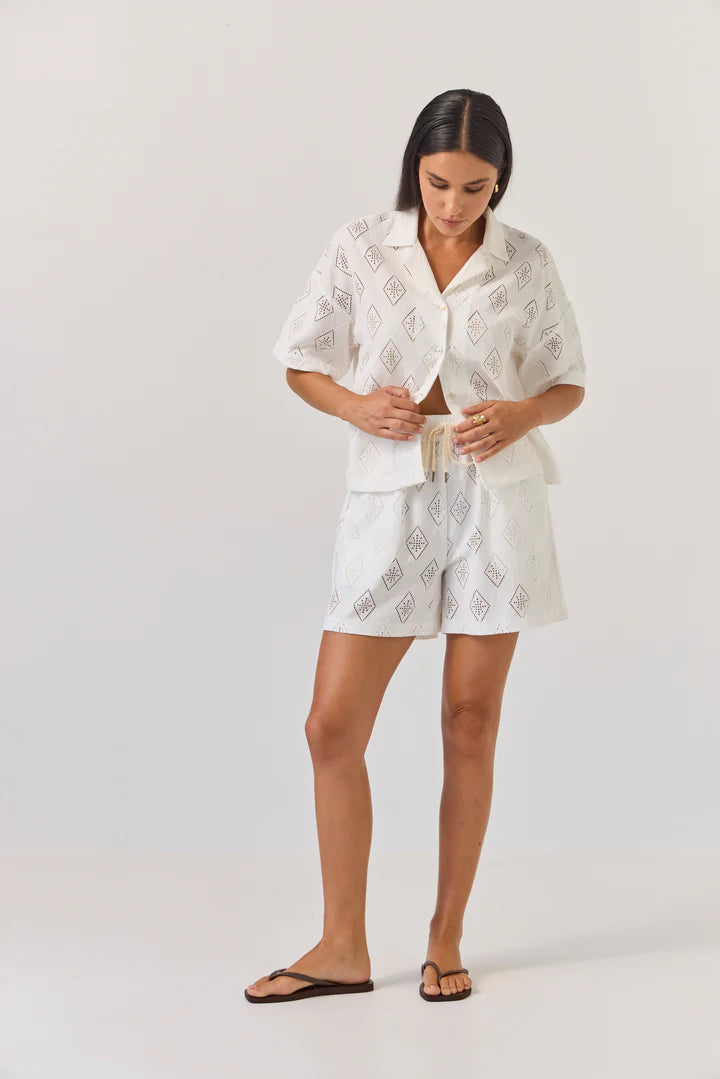 Introducing the Umpire Shorts White Diamond from Tuesday Label. These breezy casual shorts in a crisp white colour are crafted in cotton for an airy, elevated summer staple.
