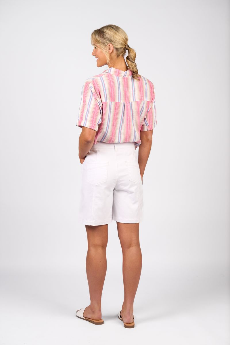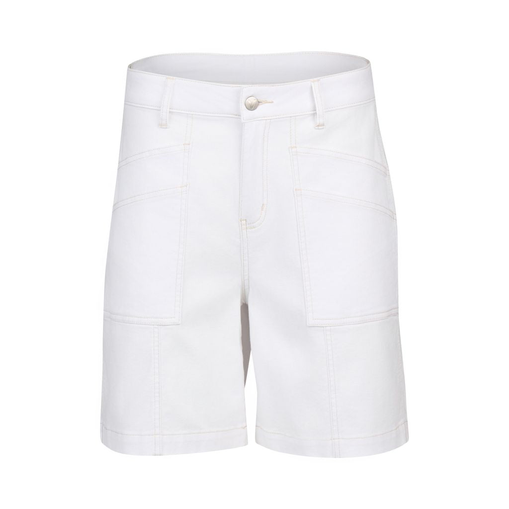 A wide leg denim short in fresh white, made from stretch fabric for comfort and ease. Designed with contrast tan stitching, statement double front pockets, and stitch-detailed back pockets for a modern summer look.
