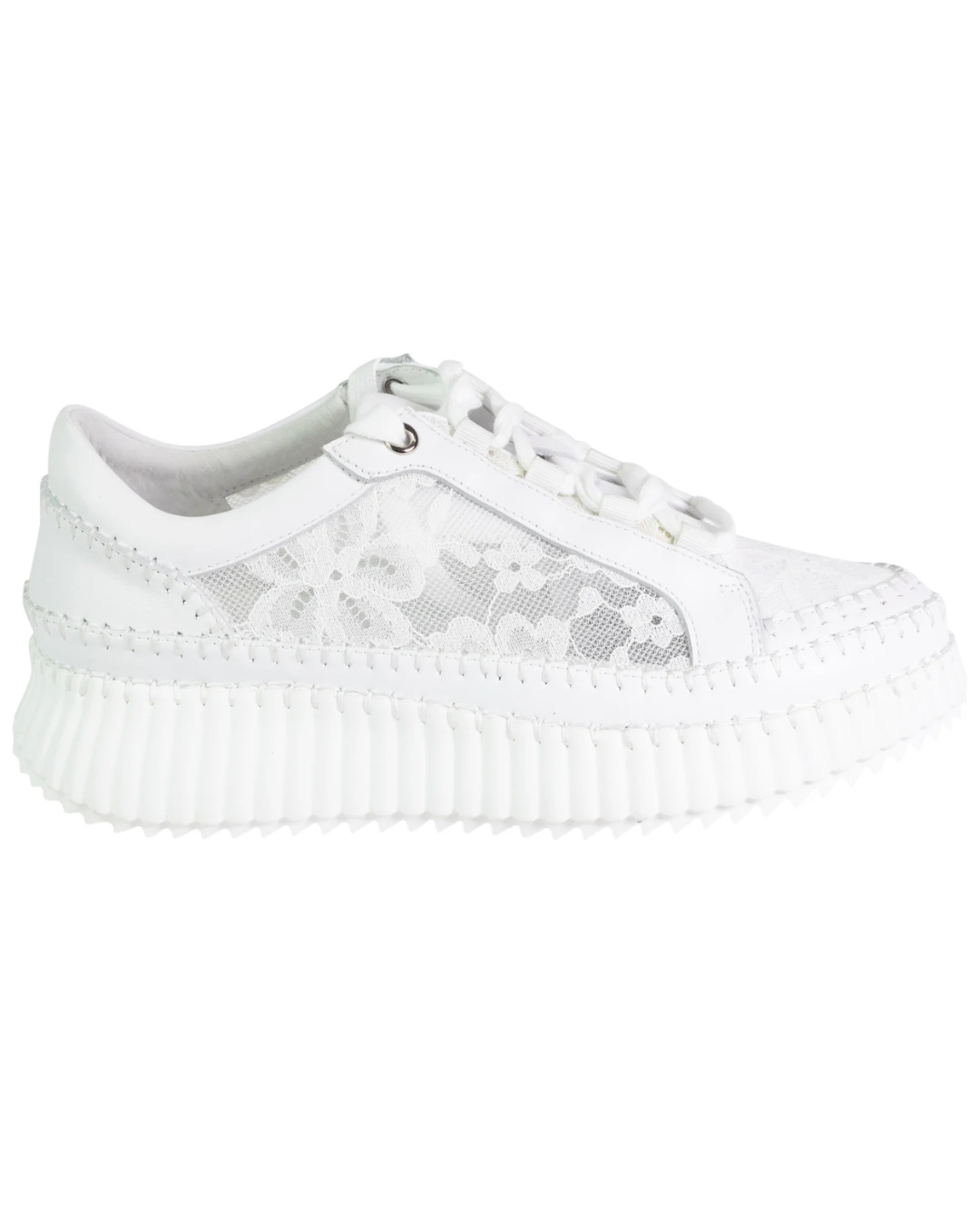 A cute as a button white summer sneaker with a bit of flair to pair with any summer outfit. The upper is leather with side detailed mesh panels. It is a lace up and has top stitching to add a little style. This all sits on a chunky white rubber sole