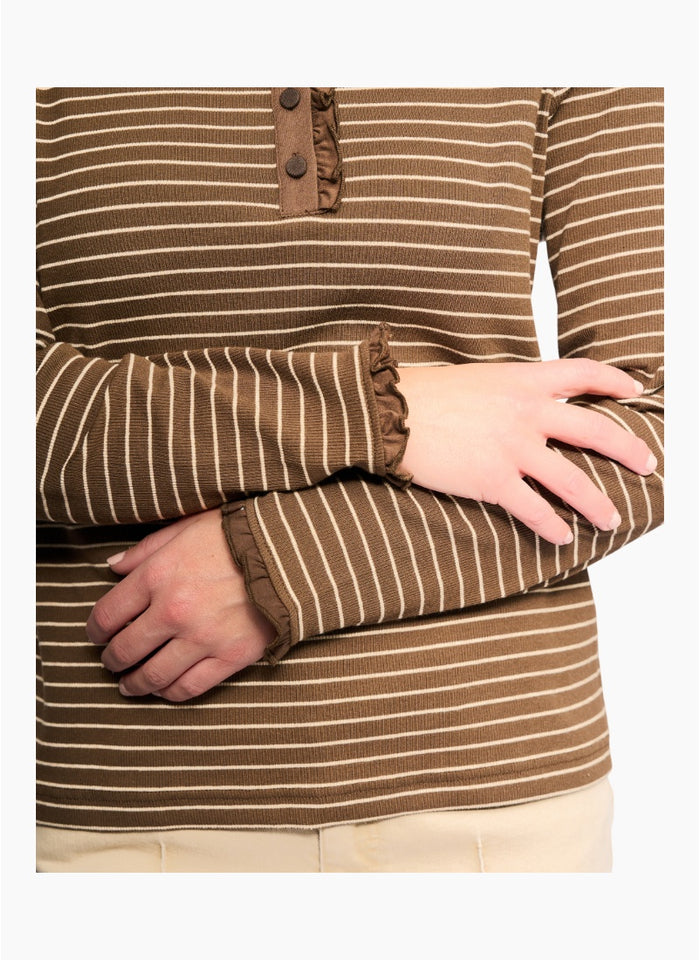 Casual long-sleeve top by Vassalli in Chocolate/Oat colourway. Designed with a round neckline and partial button placket, this style is finished with delicate ruffle detailing at the placket and sleeve cuffs for a relaxed yet considered everyday piece.